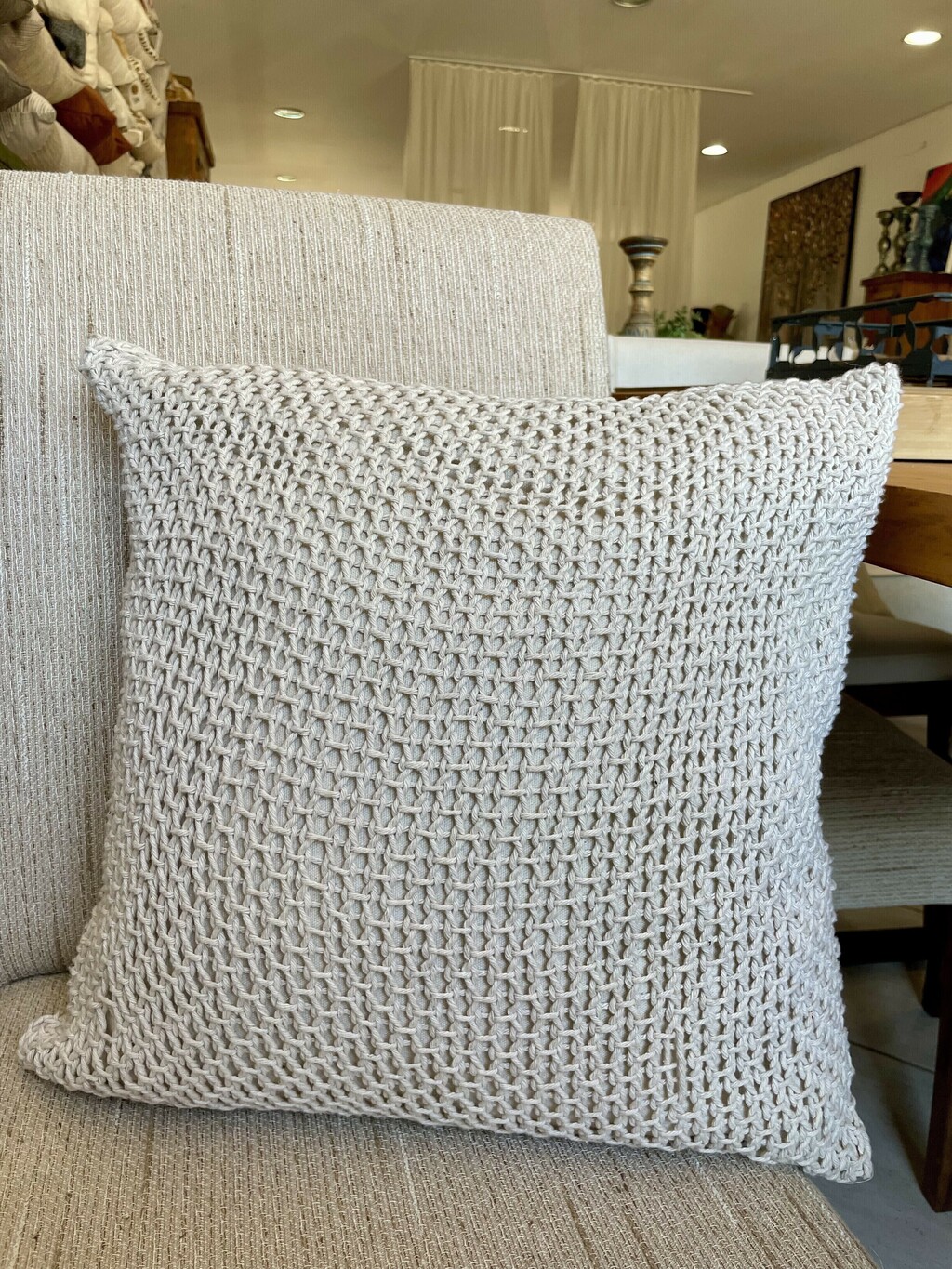 Almofada decorativa em crochê branco, feita à mão com pontos bem definidos e acabamento delicado. A peça traz aconchego e textura para a decoração, sendo perfeita para composições suaves e elegantes.