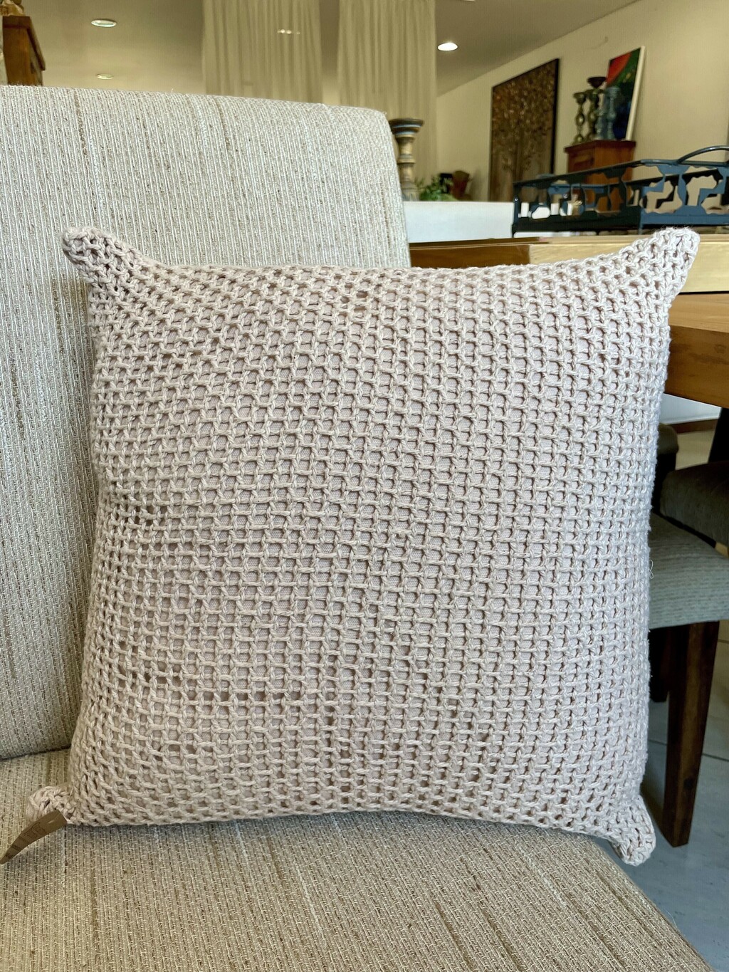 Almofada decorativa em crochê na cor salmão, feita à mão com detalhes cuidadosamente trabalhados, trazendo delicadeza e cor para o ambiente. Ideal para composições que buscam aconchego e personalidade.
