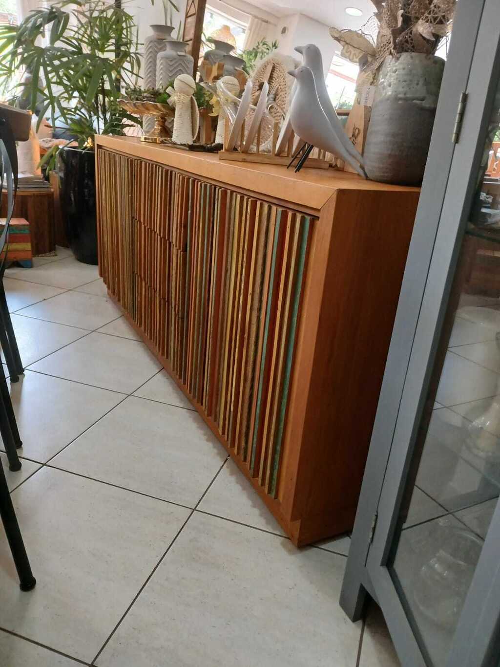 Arcaz produzido em peroba de demolição, com acabamento ripado e colorido que traz alegria e personalidade à decoração. Possui portas que oferecem amplo espaço interno para organização, combinando praticidade, resistência e estilo rústico em um único móvel.