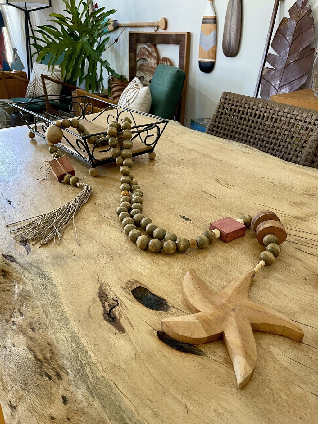 Colar decorativo para mesa feito com contas de madeira e detalhe de estrela do mar na ponta. Ideal para dar um toque de charme e descontração em mesas, aparadores ou composições com vasos e objetos decorativos.