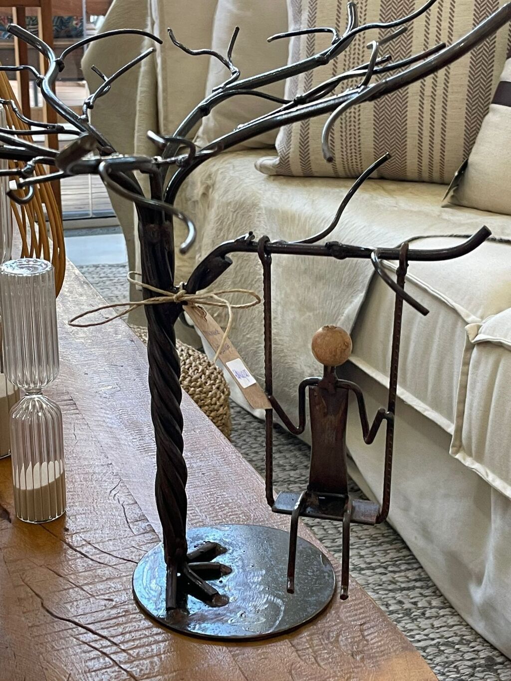 Escultura Menino no Balanço sob a Árvore em Ferro – peça artesanal produzida em ferro, que retrata de forma delicada e poética a cena de um menino brincando no balanço preso à árvore. Uma obra cheia de movimento, nostalgia e encanto, perfeita para levar aconchego e sensibilidade à decoração. Ideal para pendurar em ambientes que valorizam arte e detalhes únicos, unindo simplicidade e originalidade em um só item decorativo.