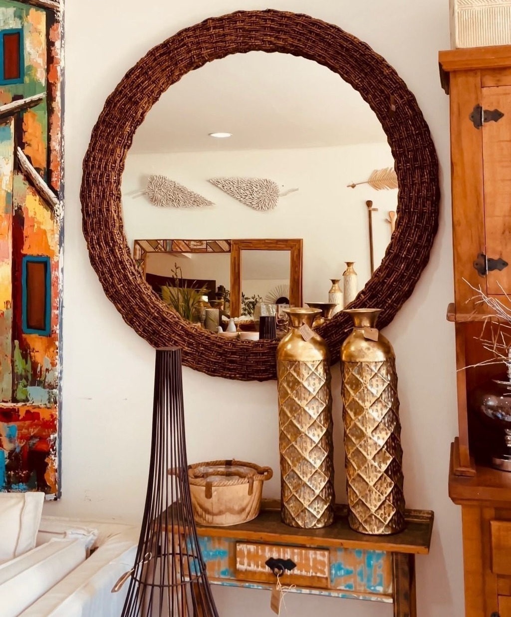 Espelho artesanal com moldura em palha de bananeira, perfeito para valorizar qualquer ambiente com estilo natural e rústico. Uma peça versátil que combina beleza e funcionalidade.