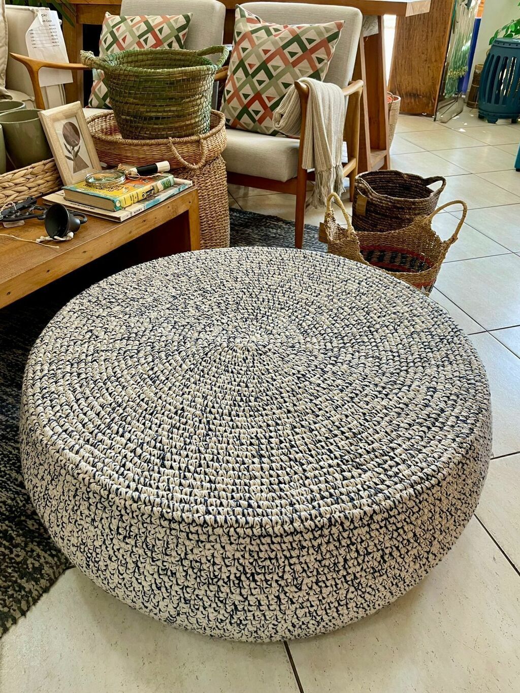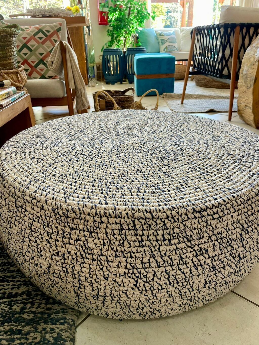 Mesa de centro com estrutura redonda e estilo puff, trazendo um visual aconchegante e ao mesmo tempo sofisticado para a decoração. A base possui acabamento tramado em corda, proporcionando textura e leveza ao ambiente, enquanto o tampo liso garante funcionalidade e equilíbrio visual.
