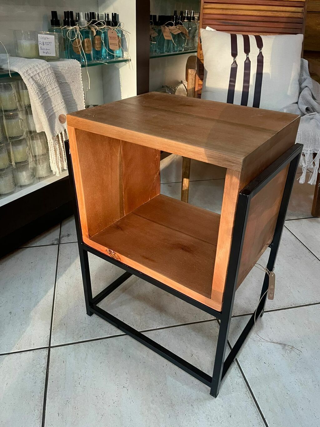 Fabricada em madeira de peroba de demolição com estrutura em ferro, é uma peça compacta, resistente e cheia de personalidade. Perfeita para ambientes menores, combina funcionalidade e elegância em um só móvel.