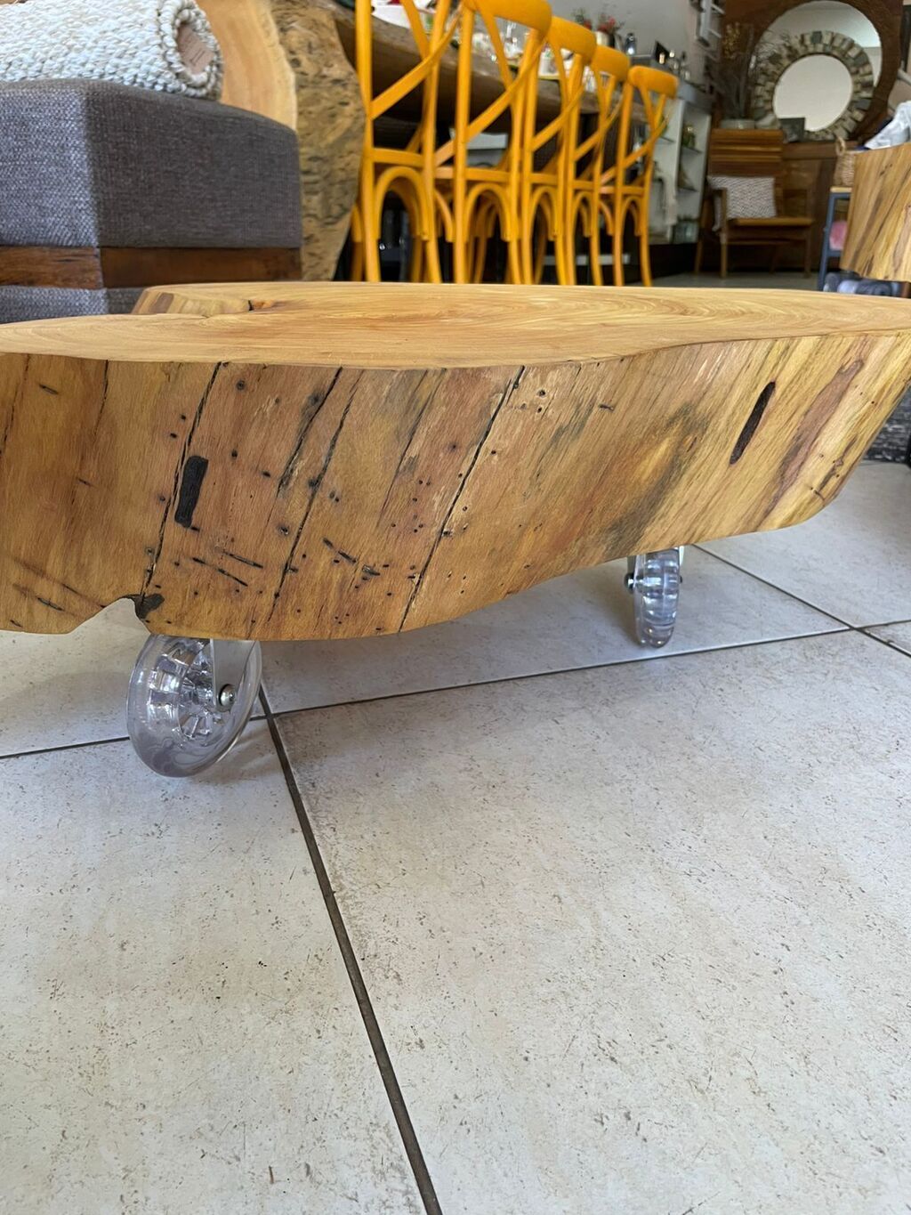 Compacta e funcional, feita em tora natural com rodízios discretos que facilitam a movimentação no dia a dia. Versátil, pode ser usada como mesa lateral, apoio para bandejas, revisteiro ou até como mesinha de centro em espaços menores. Uma peça prática sem perder o charme do rústico.