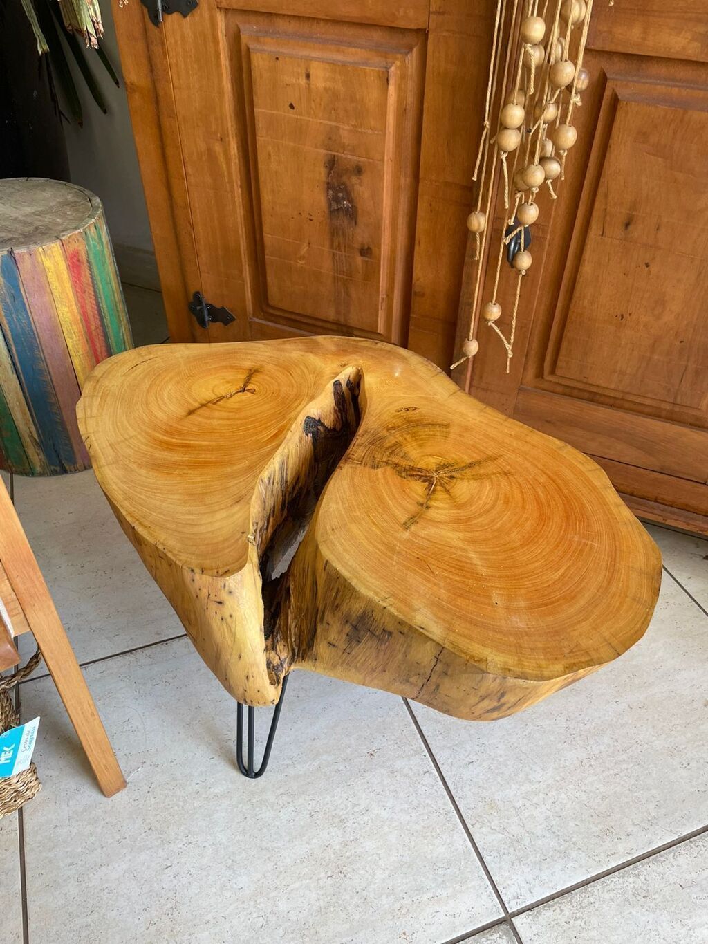 Combinando pés de ferro firmes e tampo em tora natural de peroba de demolição, essa mesinha é funcional e cheia de estilo. Seu design une o charme da madeira rústica ao toque moderno do ferro, criando uma peça versátil que se adapta a diferentes ambientes.