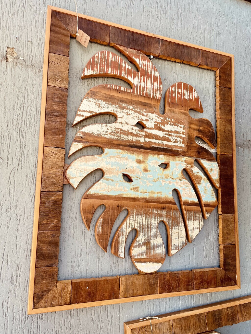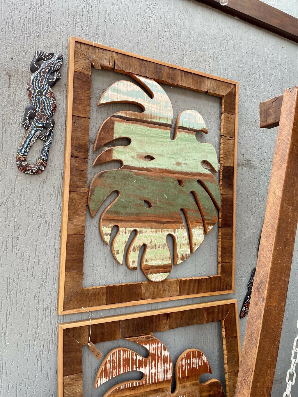 Quadro decorativo com escultura em relevo de uma folha de Costela de Adão, produzido em madeira. O acabamento valoriza as texturas naturais do material, trazendo um toque de natureza e sofisticação para a decoração de paredes.