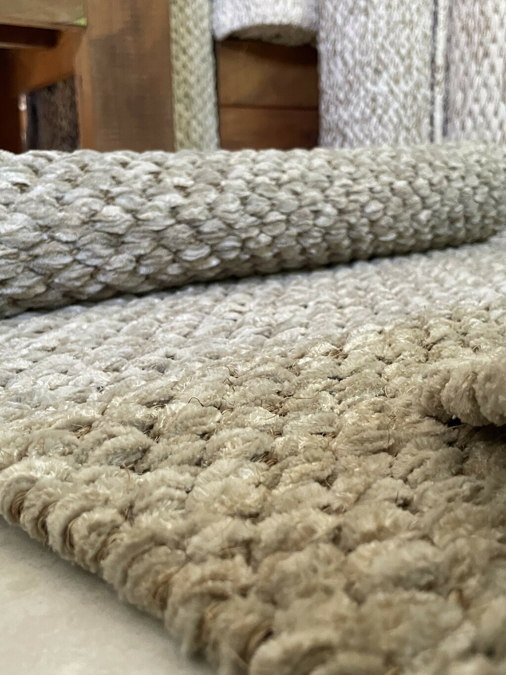 Tapete tramado com sisal em tons cinza esverdeado, ideal para quem busca um visual neutro com personalidade. Perfeito para halls, corredores ou composições com móveis naturais.